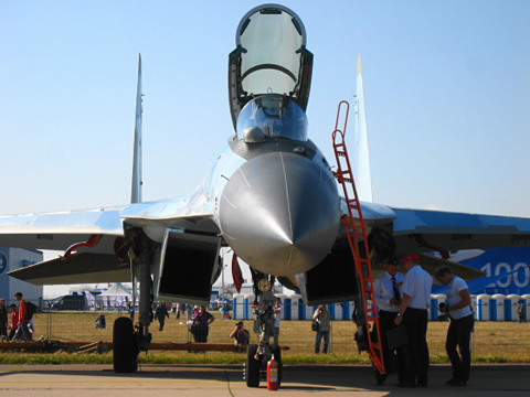 そしてなんとこれ、量産初号機でした。昨年までのMAKSではプロトタイプが出ていましたが(この日もフライトはプロトタイプでした)、ついに量産仕様初公開です。サブタイプ名がなんか変わってるはずですが、そんなん知らん(笑) Su-35Sだっけ??
