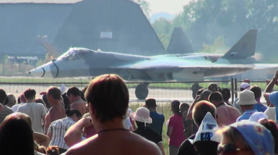 出ました、ロシア空軍ステルス戦闘機PAK-FA/T-50です!昨年のMAKSで一般初公開され、この100周年エアショーにももちろん参加です!