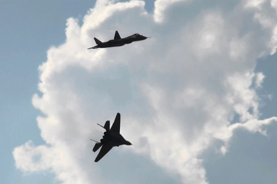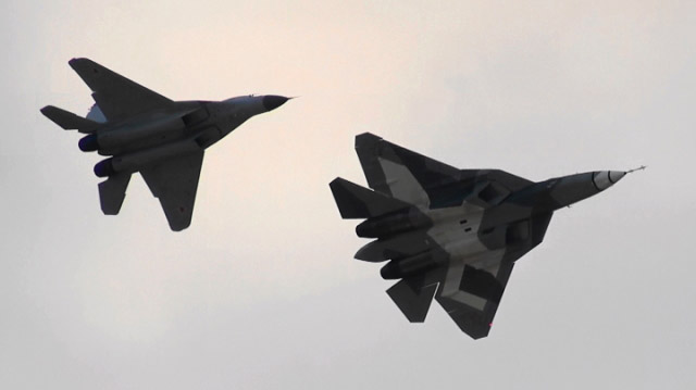 PAK-FAが合流し編隊航過!ミグとスホーイの混成編隊です。仲良し仲良し。(*^ー^*)