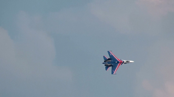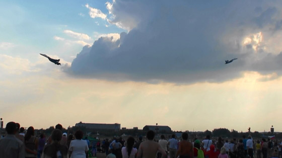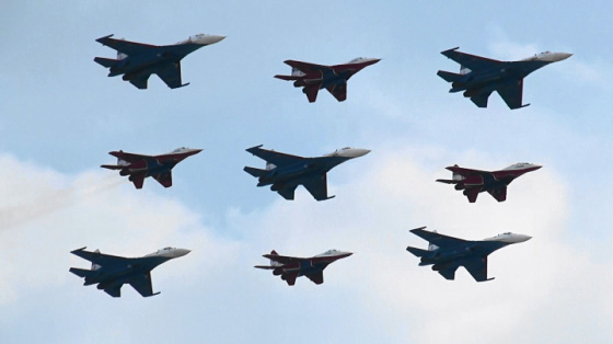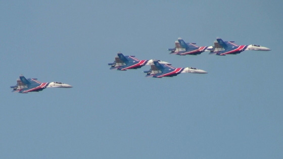 そして本日のトリを務める編隊がやってきました!出ましたロシア空軍アクロチーム、ロシアンナイツとストリジィの豪華混成編隊です!