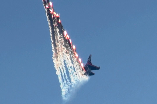 フレアを使っての派手なブレイクは健在です!はい、ストリジィ&ロシアンナイツ、ロシア空軍最高のデモでした!