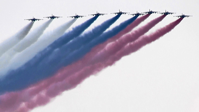 本日のフィナーレを飾るフラッグパス。Su-25が、朝よりさらに機数を増やしてとても大きなロシア国旗を空に描いていきます。
