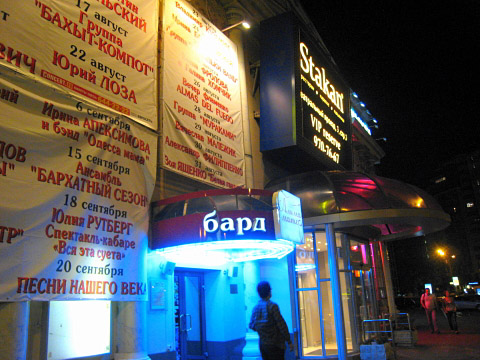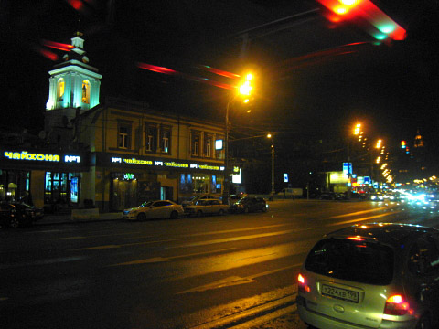 すっかり暮れたモスクワの夜。キリル文字がいっぱいです。雰囲気あるっしょ^^