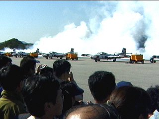 あ、なんか懐かしいスモークチェック!T-2ブルーを思い出しました。やっぱりブラックイーグルスの前は人だかりが出来ていました。ブラックイーグルスの歴史は1962年まで遡ります。BlueSabreのコールサインでF-86により1965年まで活動、1966年にBlackEaglesと改称し機体もF-5Aに転換しました。1978年シーズンでいったん活動を停止し、その後、1994年に現在のA-37Bをもって突如として復活。その際にメンバーをT-2ブルーに派遣して体験搭乗など行ったことも知られています。現在、部隊はウォンジュー基地に住んでいます。