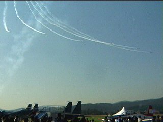 トレイルループを見せた編隊はダイアモンドに移行し、そしてそのままテグッキに向けてバーティカルスプリット!課目構成がうまいなあ。