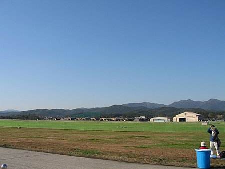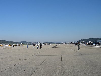 すんごい良い天気!会場です。エプロンというか、1本の滑走路です。(^^ゞ早い時間はまだ人が少ないのです。だだっ広い荒野に岩山のネリス、のどかな緑の広場だったフェアフォード、それに対してこんな感じ。背の低い山に気持ちの良い澄んだ空気、ちょっと日本に似た雰囲気、ソウルでございます♪