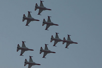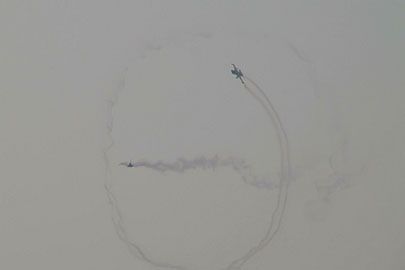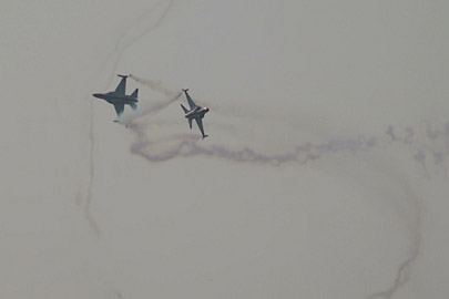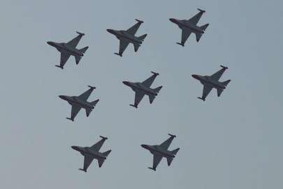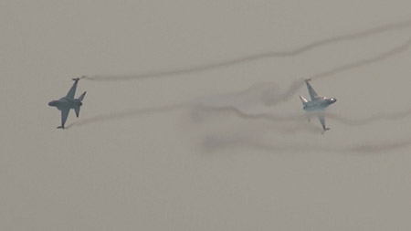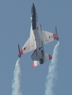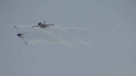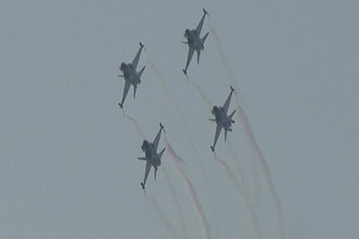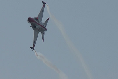 で、これ!ちょっと怖いな、と感じた課目。ハイαでゆっくり飛ぶ機体の下を高速で追い越し、目の前で引き起こしてループに移ります。航跡がかなり近いところで交差する感じです。特に二日目は物凄く近いと感じました。93年、RIATでのMiG-29チームの衝突を連想したわ。何らかの原因でタイミングがずれたらヤバイ課目です。いままで各国のいろんなアクロを見てきて、いろいろハラハラドキドキさせて貰いましたけど、これはそれらとは別の“怖さ”がありました。つっても、ブラックイーグルスはプロですから素人の私が感じることなんかよりずっと緻密に研究してるんでしょうけど・・・直感として怖かった。プロとは言っても上記MiG-29チームもやらかしてますし、古くはラムシュタインでのフレッチェトリコローリとか、それなりに暗い過去はあります。