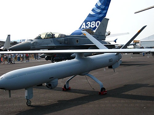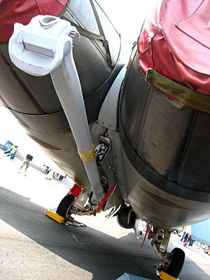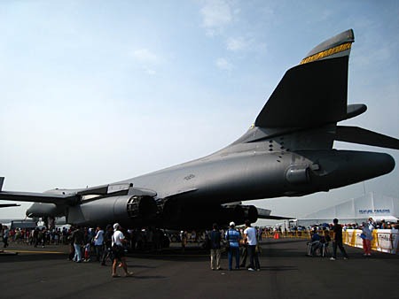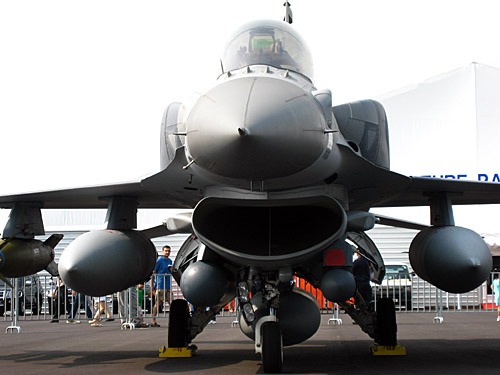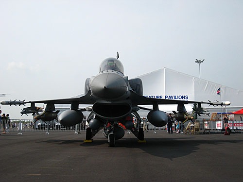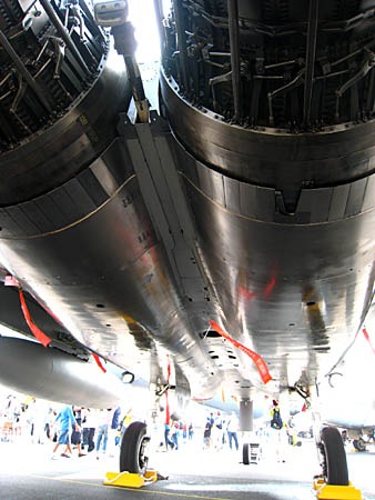 お腹の下に入ってみました。今回はアメリカのメーカーからの直接出品はなかったものの、アメリカ国防省が空軍、海軍から機体を送り込み、フライトもF-16デモチームとF/A-18Eが参加、面目を保った・・・って感じだそうです。