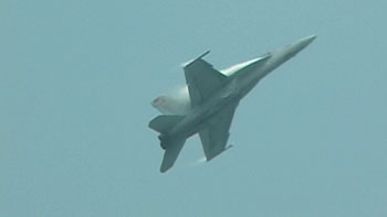 さて、米軍も存在感を示さなきゃね。アメリカ海軍のF/A-18Eがデモしました。機体はVFA-27。ご存知ですよね。