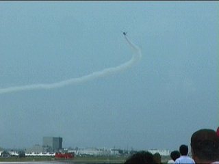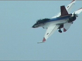 出た!今年も来ました、飛実のF-2!ご近所さん登場です!!今年は昨年までのデモパターンと大きく変わりました。だって、最初の登場からいきなりハイスピードでのナイフエッジですよ。ありえん…って、この画像はそれじゃないんですけどね。だって、携帯で撮ってたらビデオ撮りのがしたんだ。(笑)