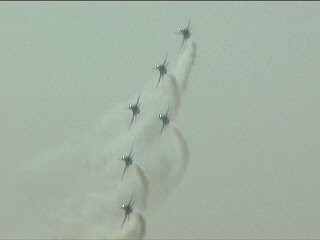 はい、今度こそ成功!!開いた編隊の間をソロが駆け抜けるように見えるこの課目、次はばっちり決まりました!!それにしても、アクロってそれぞれのタイミングでの各機の位置が凄く重要なはず。実際に演技に絡まない機体も所定の場所を回って次の課目に備えているはずです。それをすべて調整しなおして課目をもう一度やり直すバーズってかなり凄いと思いました!!