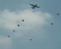 さて、先ほどのC-130から沖縄の海兵隊員が空挺降下してきます。3機のハークから次々と降下する様は圧巻です。